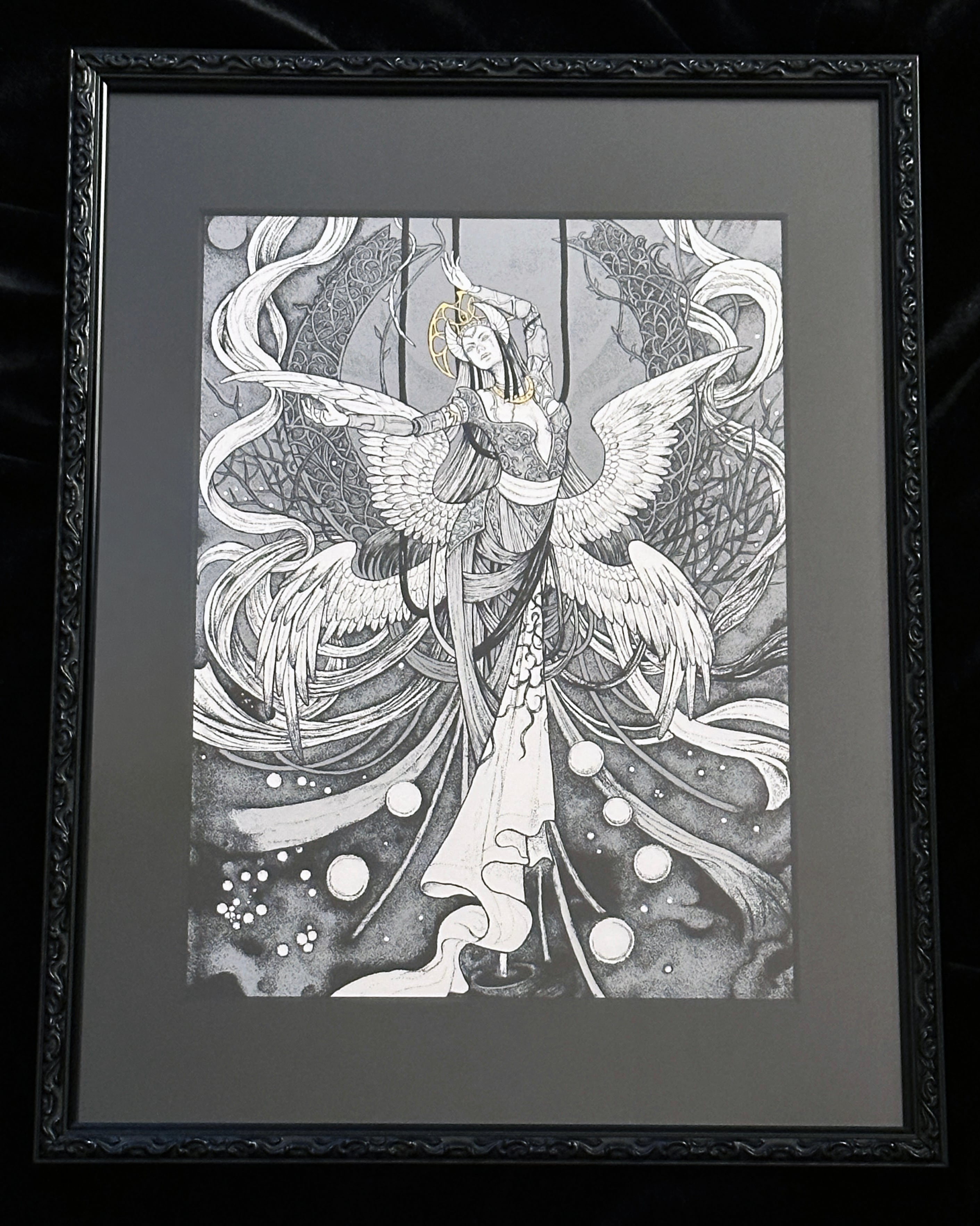 神話における光と闇、その境界に存在するものを主題に、ペンとデジタルを融合したミクストメディア作品を制作している。